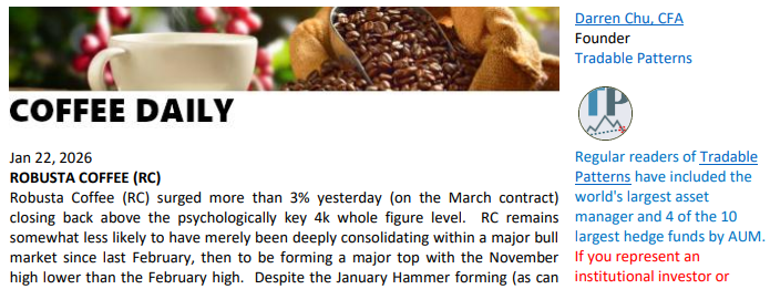 To trial Coffee Daily, please write to [email protected] and indicate whether you represent a commodity trading firm, brokerage or hedge fund. These reports are not available at retail rates. Subscribers of Coffee Daily also have access to Week’s Top 3 Trades.