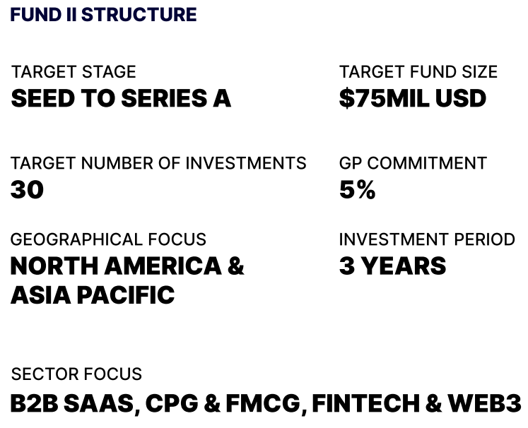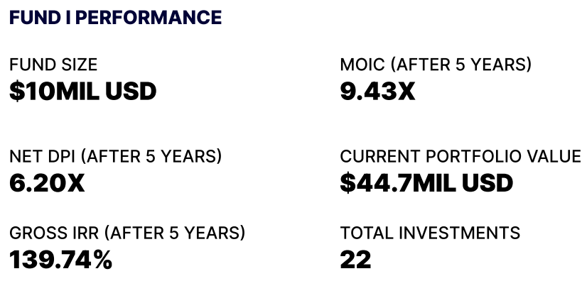 - Targeting USD 30M fund size (w/ USD 25M raised and deployed)