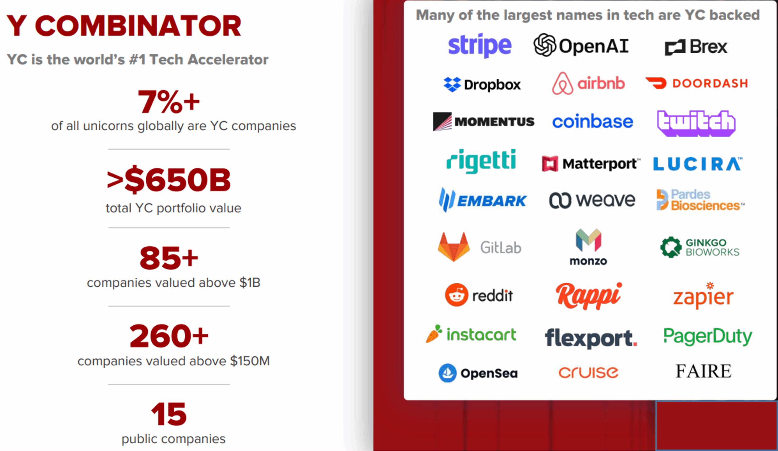 - YC has produced 7% of all global unicorns (86+ companies valued > USD1B), 260+ > USD 150M, 15 public companies